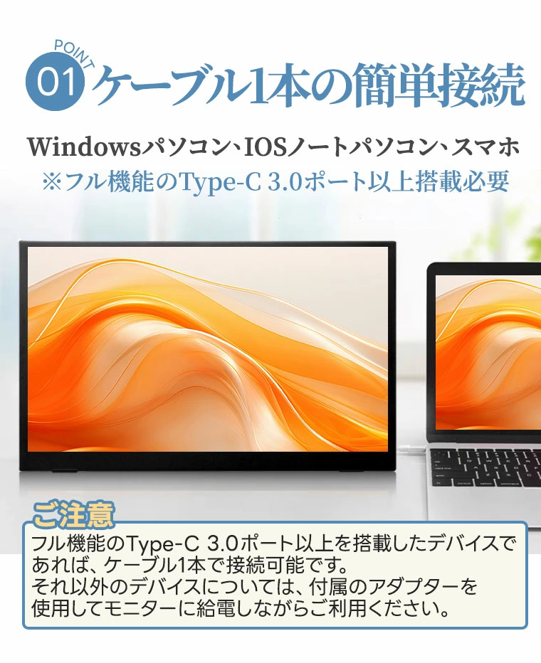 - Type-C給電: USB-C ケーブル1本で映像伝送と電源供給を同時に行える規格。