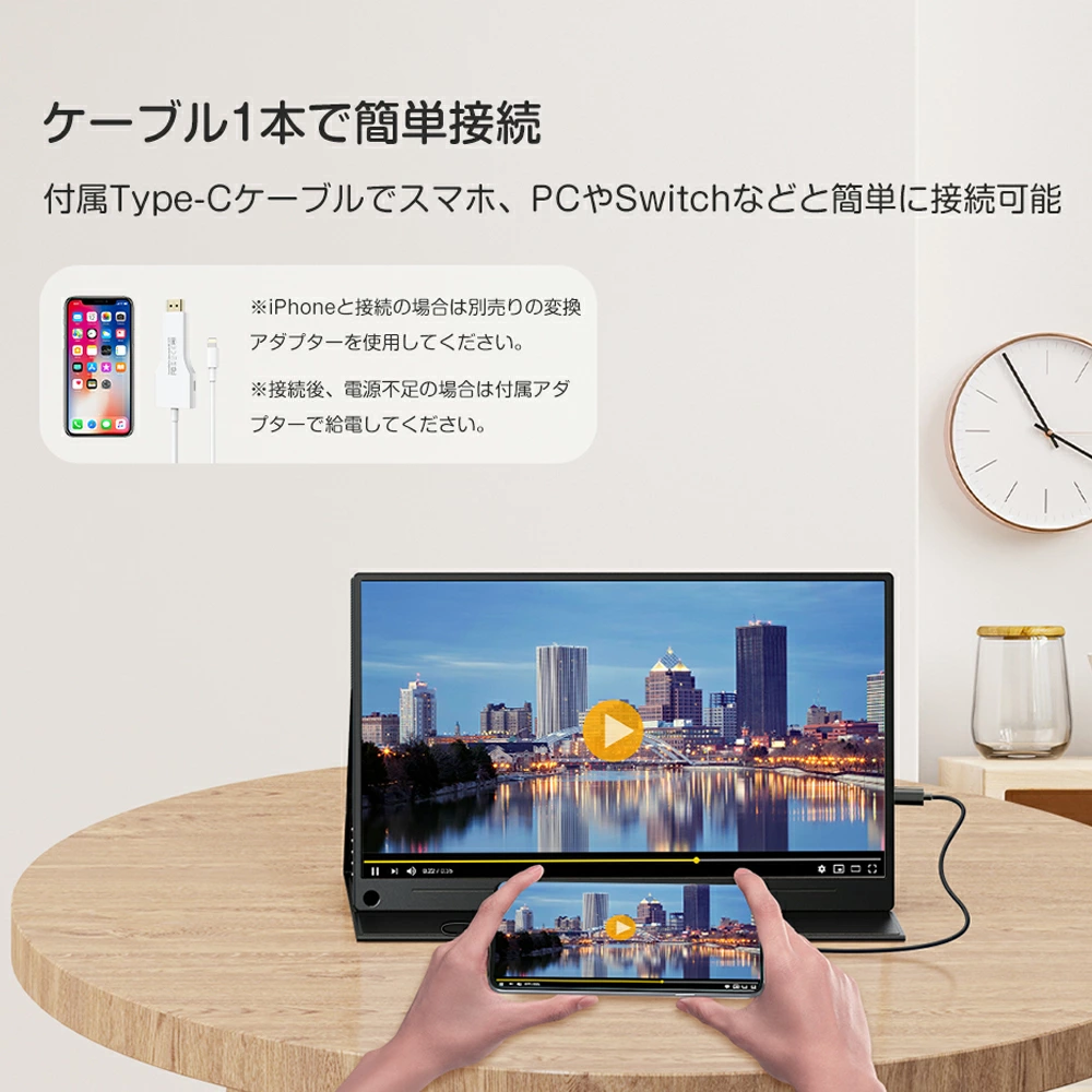 - Type-C一本で映像入力+給電が可能なため、ケーブルの煩雑さを軽減