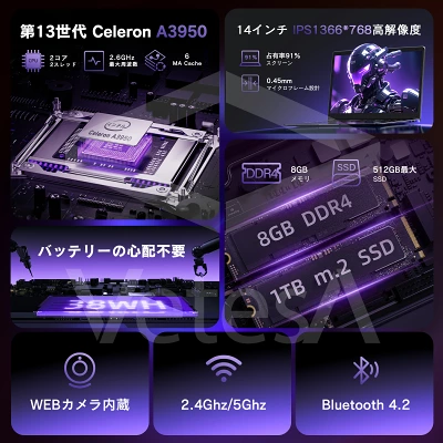 - CPUはエントリーレベルのCeleron系のため、高負荷な作業や大容量編集には限界がある