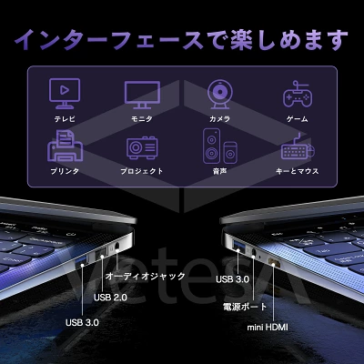 端子/規格 | USB-A/USB-C等は機種依存。無線LANは外付USB無線LANアダプター経由での使用を想定。Bluetooth搭載。 |