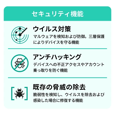 - 包括的な保護機能:ウイルス・スパイウェア対策、ファイアウォール、フィッシング対策、迷惑メール対策を1つのパッケージに集約。